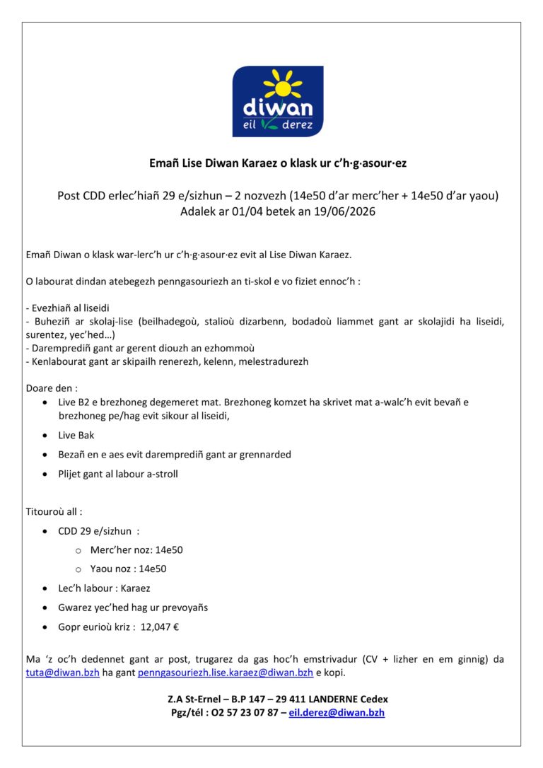 Emañ Lise Diwan Karaez o klask ur c'hasour pe ur gasourez : Post CDD erlec’hiañ 29 e/sizhun – 2 nozvezh (14e50 d’ar merc’her + 14e50